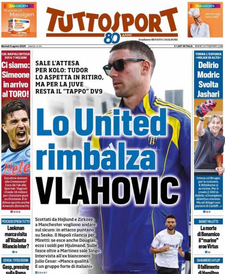 Infine, Tuttosport apre con un focus sull’attacco della Juventus. Sempre in attesa del ritorno di Kolo Muani, rimane il “tappo” Dusan Vlahovic, che intanto non è nella lista del Manchester United. I Red Devils, reduci dalle brutte esperienze con numeri 9 come Zirkzee e Hojlund, hanno messo nel mirino Sesko. Spazio poi anche a Simeone-Torino e di nuovo a Modric.