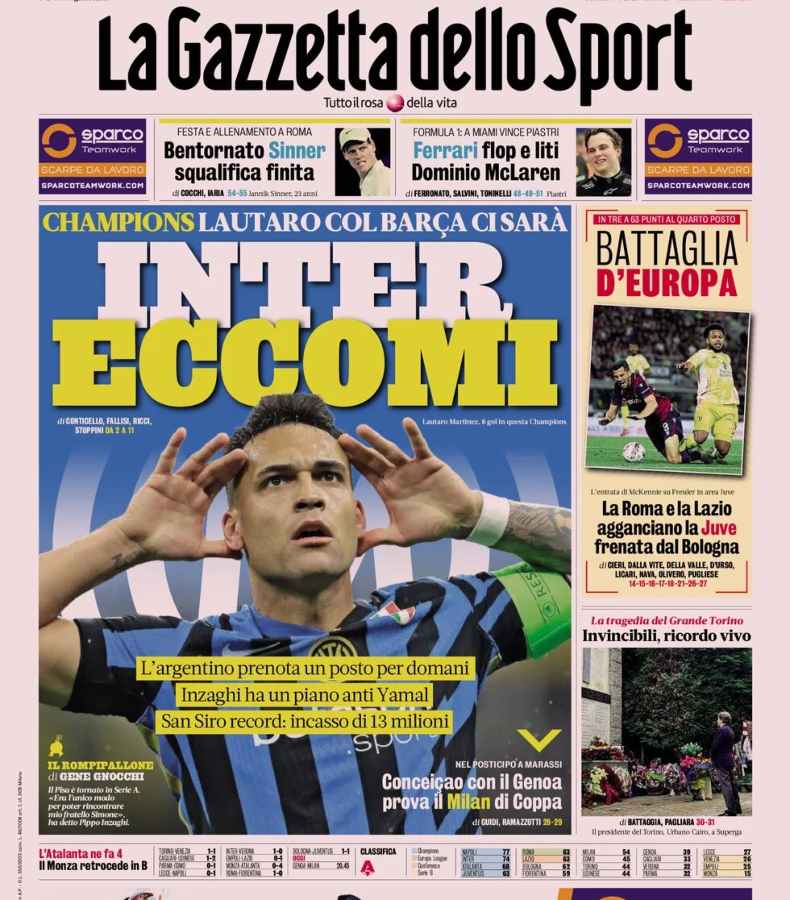 “Inter, eccomi”. Apre con questo titolo ‘La Gazzetta dello Sport’. Il riferimento è a Lautaro Martinez: l’attaccante argentino sarà a disposizione per la semifinale di ritorno di Champions League contro il Barcellona.