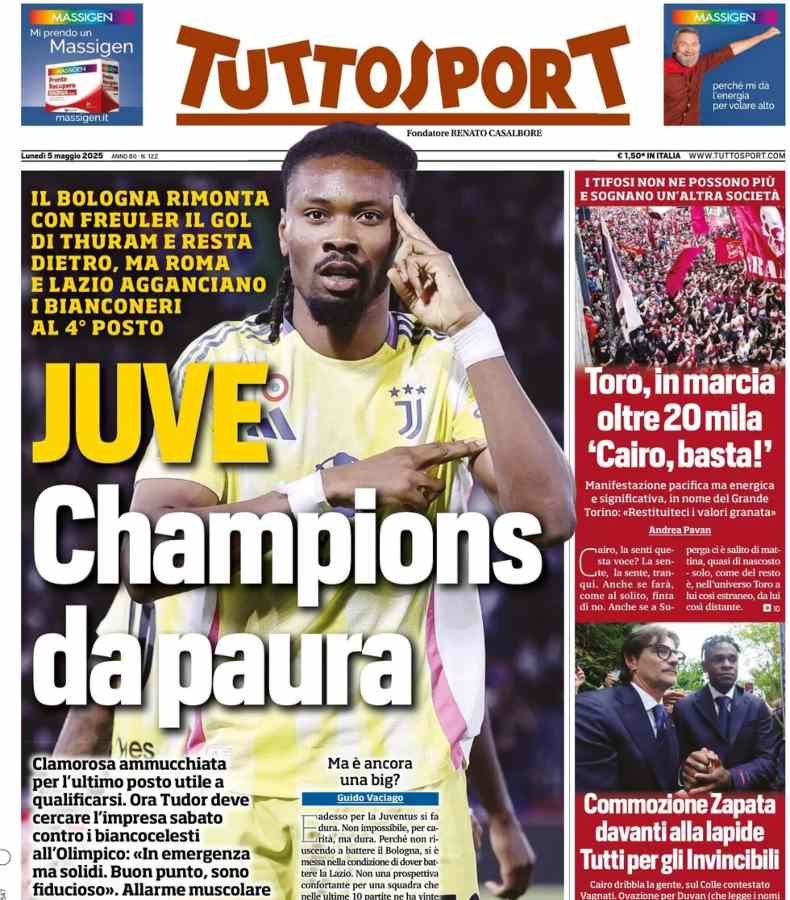 Il ‘Corriere dello Sport’ dedica ampio spazio alla corsa verso l’Europa. La Juventus e il Bologna pareggiano 1-1. La Lazio vince contro l’Empoli e la Roma ai danni della Fiorentina.