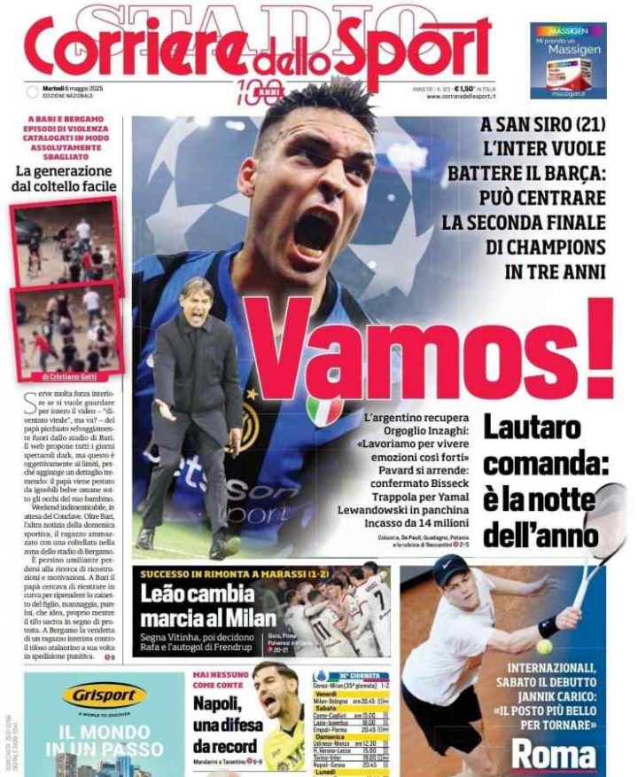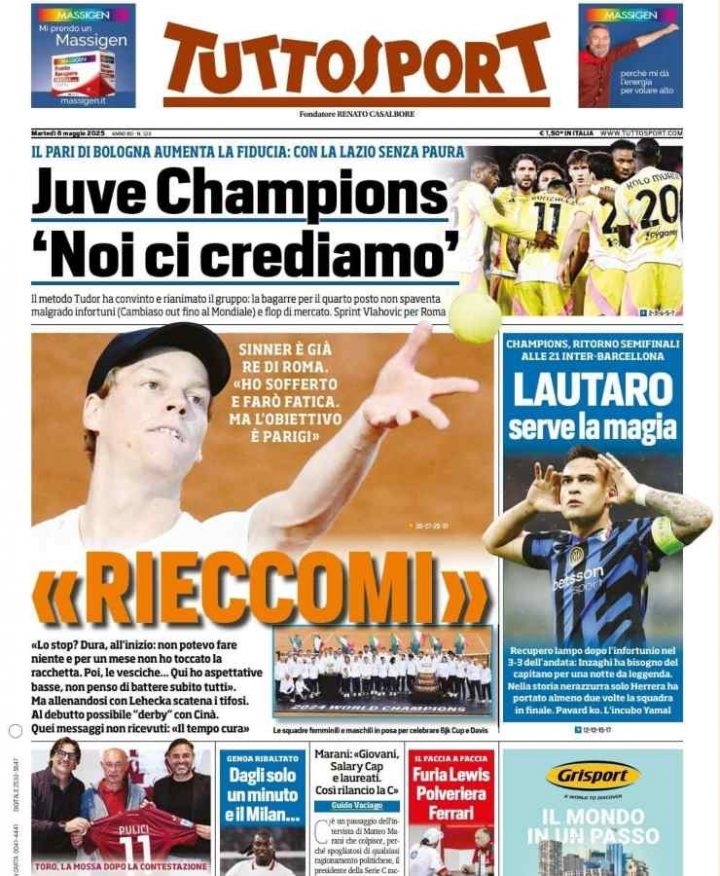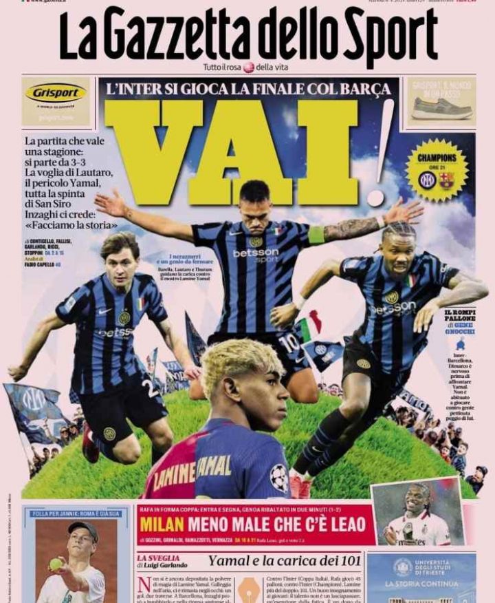 La Gazzetta dello Sport si concentra sulla semifinale di ritorno tra Inter e Barcellona. L’andata era terminata sul 3-3, sarà quindi decisiva la partita di stasera, martedì 6 maggio, a San Siro. Spazio anche alla vittoria del Milan contro il Genoa e il ritorno in campo di Jannik SinnerIl Tuttosport apre con il ritorno in campo di Jannik Sinner agli Internazionali di Roma. Spazio anche alla lotta Champions in Serie A in cui anche la Juventus è protagonista e la sfida di ritorno della semifinale tra Inter e BarcellonaIl Corriere dello Sport si concentra sull’Inter in Champions: per accedere alla finale servirà vincere stasera a San Siro contro il Barcellona di Flick. Spazio anche per la vittoria del Milan contro il Genoa nella 35esima giornata di Serie A e il ritorno in campo di Jannik Sinner agli Internazionali di Roma