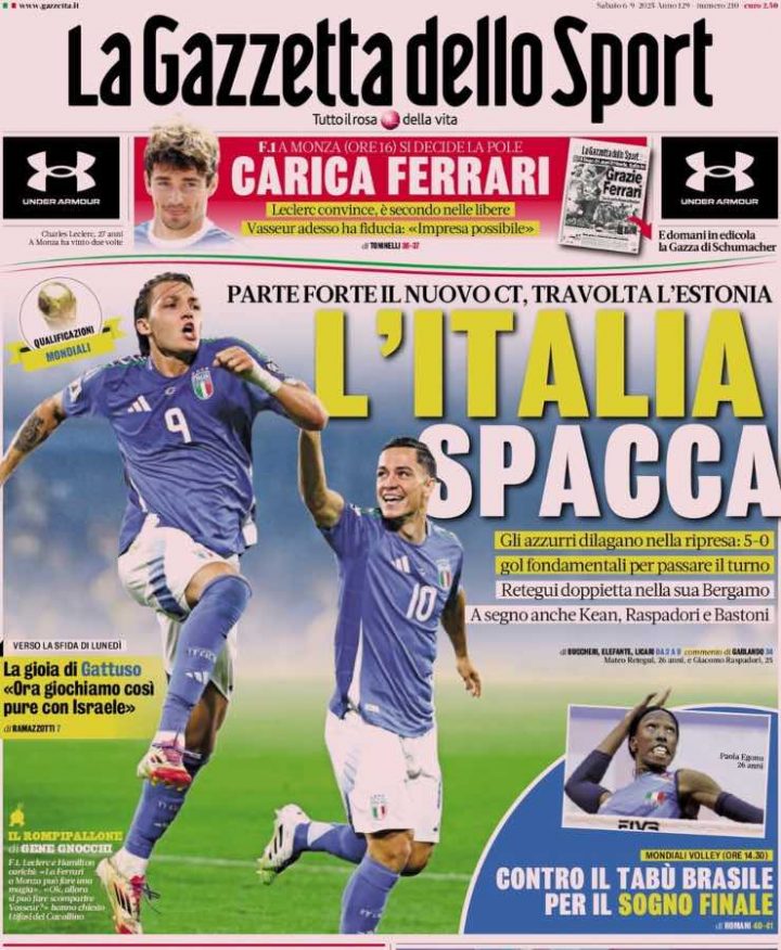 La Gazzetta dello Sport apre con la vittoria dell’Italia all’esordio di Gattuso come CT: gli azzurri vincono per 5-0 con l’Estonia. Spazio anche alla nazionale femminile di pallavolo, impegnata nelle semifinali dei Mondiali.