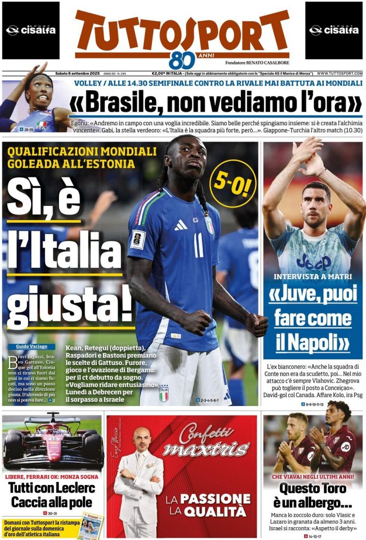 Infine anche Tuttosport si concentra sulla vittoria convincente degli azzurri, per poi passare alla semifinale di volley femminile e alle qualifiche del Gran Premio di Monza.