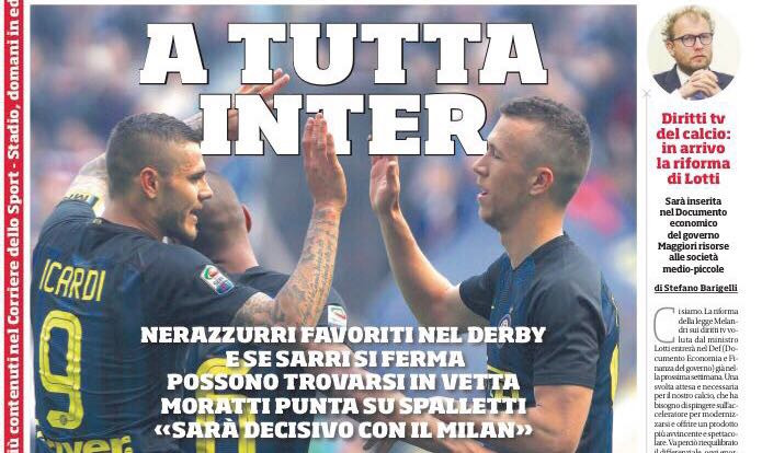 “A tutta Inter”, i nerazzurri per il Corriere dello Sport sono i favoriti nel derby di Milano e se il Napoli si ferma, possono ritrovarsi in vetta. In alto spazio al calciomercato con il Napoli che ha pronto un piano per raggiungere Chiesa, pronti quaranta milioni di euro per il giovane viola, ma Della Valle fa muro. In basso invece la sfida tra Juventus e Lazio, con chiellini che festeggia i 12 anni con la Juventus, mentre Inzaghi punta su Leiva per arginare Dybala.