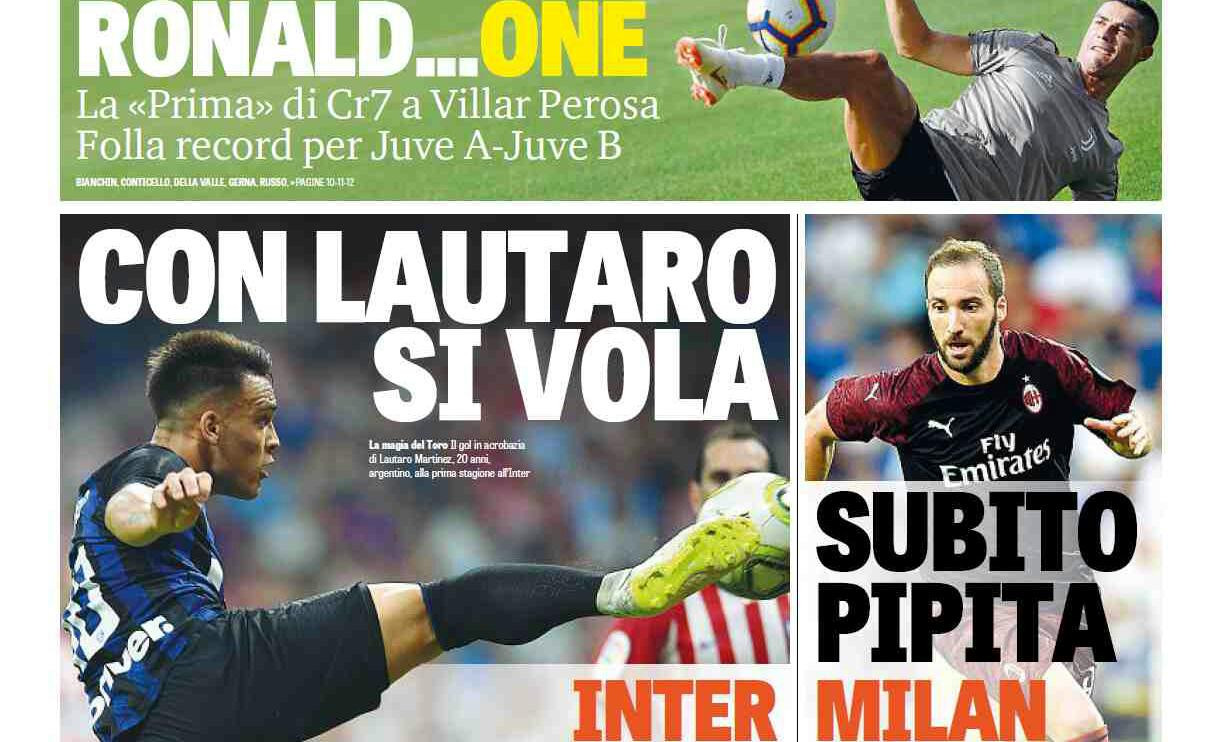 Tanta Inter e amichevoli di fine estate. Questi gli argomenti principali presenti nelle prime pagine dei quotidiani sportivi italiani in edicola domani mattina. Il Corriere dello Sport titola sul magnifico gol di Lautaro Martinez realizzato contro l’Atletico Madrid: “Acà Toro!”. Nel trafiletto basso si parla poi di Milan: “Higuain in 4 minuti”, visto il gol del Pipita all’esordio in rossonero contro il Real Madrid.