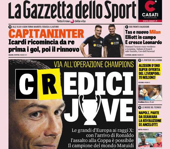 La Gazzetta dello Sport apre con gli intrecci di mercato tra Milan e Juventus. Dopo l’incontro tra Leonardo e Marotta, adesso è stata avviata una mega operazione che convolge Higuain, Bonucci, Benatia, Caldara e Pjaca.
