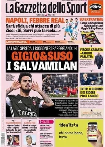 Iniziata la seconda settimana degli ottavi di Champions. Juventus impegnata contro il Porto ed i bianconeri vincono in trasferta 2-0. La Gazzetta dello Sport apre con “Bene, bravo, Max” a sottolineare l’importanza dei cambi effettuati da Allegri per la vittoria ad Oporto e l’ipoteca della qualificazione. Nella ripresa infatti il tecnico scatena le sue super riserve: Dani Alves e Pjaca vanno in gol e si bevono il Porto. Taglio basso dedicato all’Inter con il papà di Gagliardini che racconta il figlio, al Milan con Cannavaro che offre milioni l’anno a Bacca e sulla Fiorentina che si prepara all’Europa League. Infine spazio anche alla questione stadio della ROma con Grillo che tuona: “Si farà, ma non a Tor di Valle”.