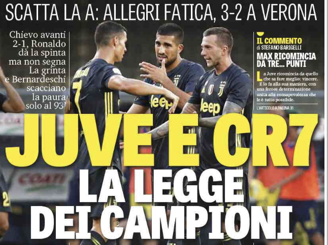 La Gazzetta dello Sport titola sulla vittoria della Juventus a Verona: “Juve e CR7, la legge dei campioni”.