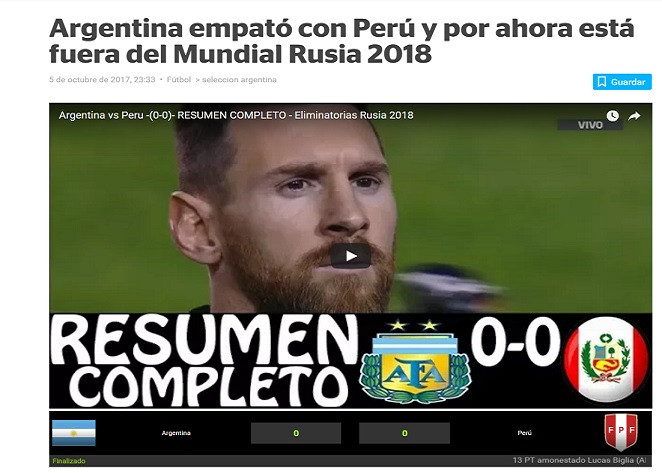 Prime pagine argentine, ecco la reazione dei quotidiani dopo lo 0-0 contro il Perù: “Non c’è stadio, avversario né formazione che vadano bene all’Argentina”, titola “La Nacion, “il destino della Seleccion dipende dalla partita contro l’Ecuador”. Clarin: “L’Argentina si giocherà tutto contro l’Ecuador. Serve vincere per andare in Russia”. La Voz: “L’Argentina, al momento, è fuori dai Mondiali 2018”