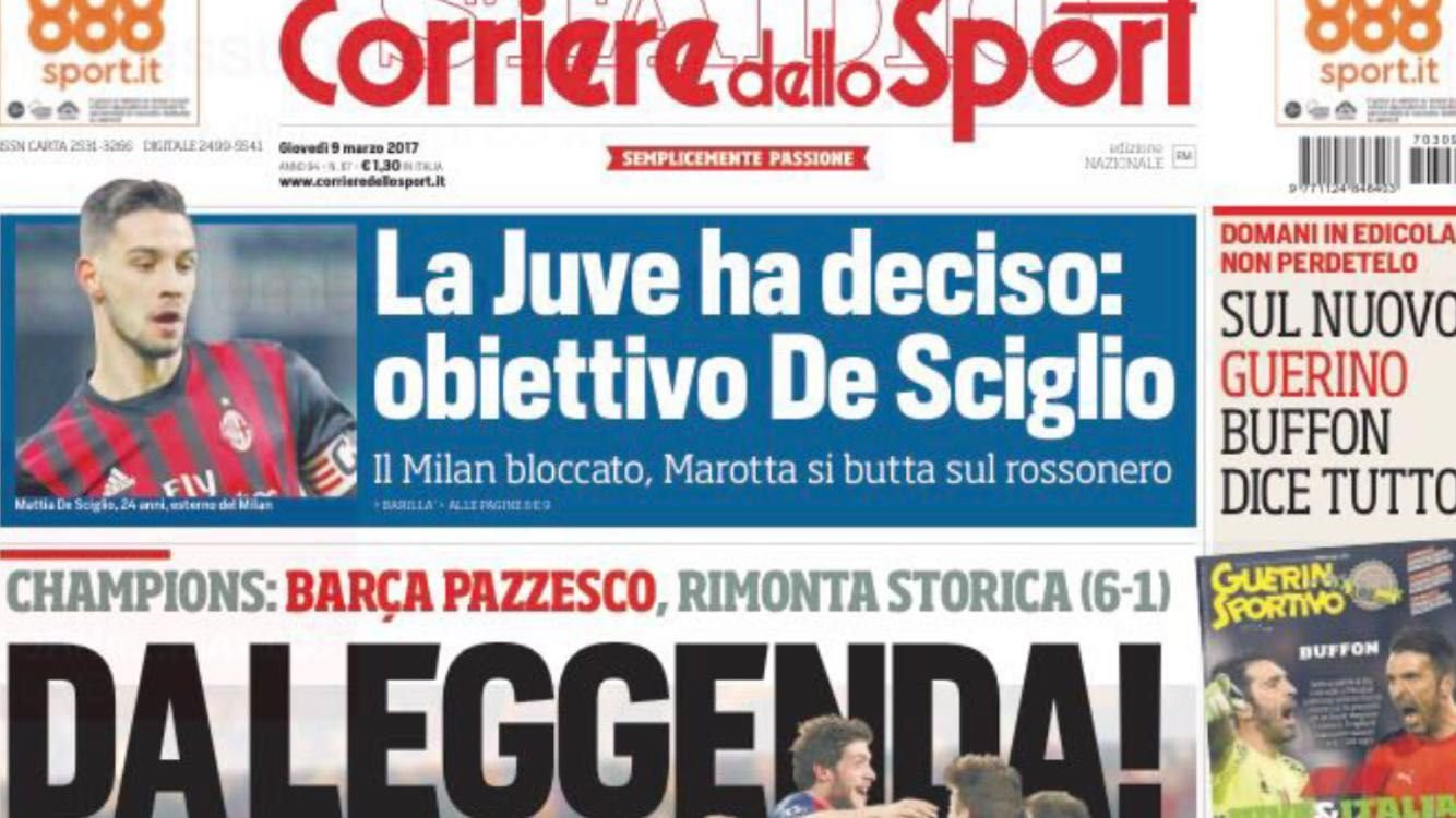 Su il Corriere dello Sport è un “Barça da leggenda” con la rimonta storica del Barcellona che ha giocato un match pazzesco. In taglio alto spazio al mercato con la Juventus a caccia di rinforzi per la prossima stagione e l’obiettivo potrebbe essere De Sciglio, terzino del Milan. In taglio basso c’è un’intervista esclusiva al Papu Gomez, che confessa: “Ero già dell’inter”.