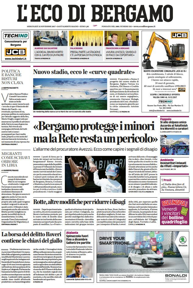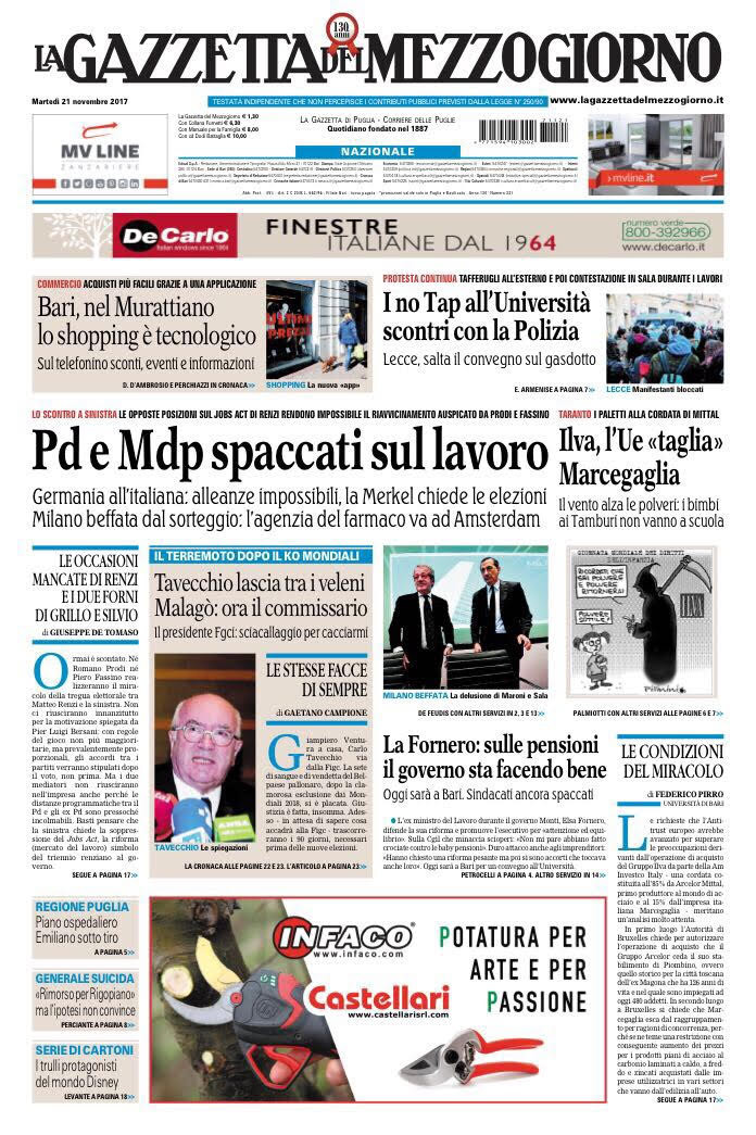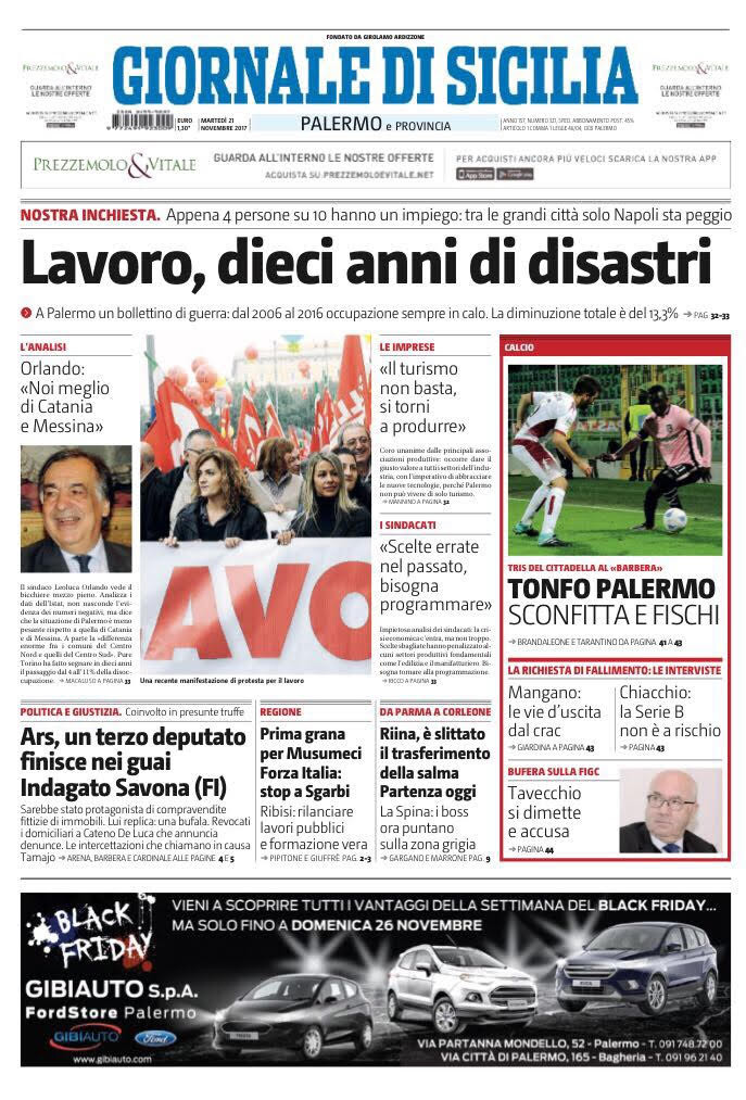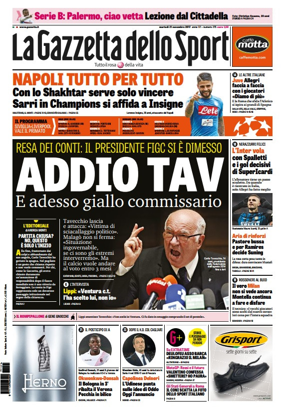 Il Giornale di Sicilia parla del “Tonfo Palermo, sconfitta e fischi”. Su Il Mattino tanto calcio: “Tavecchio lascia, il ribaltone del calcio”. Poi Napoli: “Lo Scudetto resta la priorità, ma la Champions va onorata”. Su il Resto del Carlino: “Il Bologna si rialza e conquista Verona”. Sull’Eco di Bergamo c’è un’intervista a Luca Percassi, amministratore delegato dell’Atalanta ed ex calciatore del Chelsea, che racconta la sua Inghilterra.