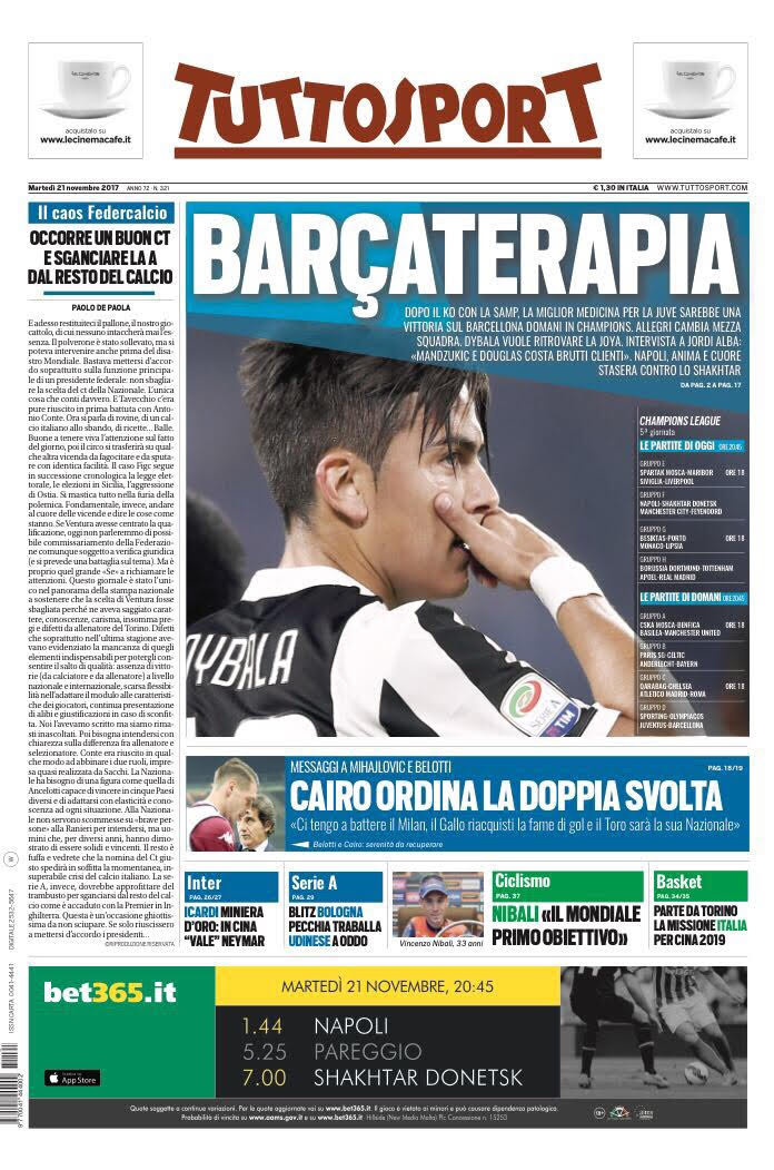 La Juventus cerca di guarire dopo la sconfitta contro la Samp con la “Barçaterapia“, questo il titolo di Tuttosport. Che in basso parla di Torino: “Cairo ordina la doppia svolta”.