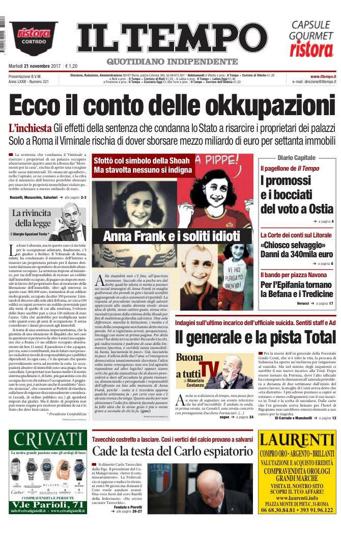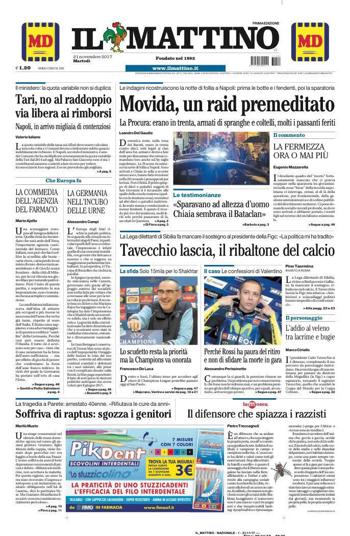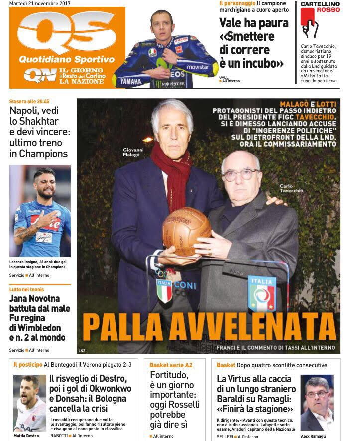 Su QS la “palla avvelenata” del calcio italiano, tanto spazio alle dimissioni di Tavecchio e non solo. Il Tempo parla di “Carlo espiatorio” mentre la Gazzetta del Mezzogiorno dice che Tavecchio “lascia tra i veleni”.