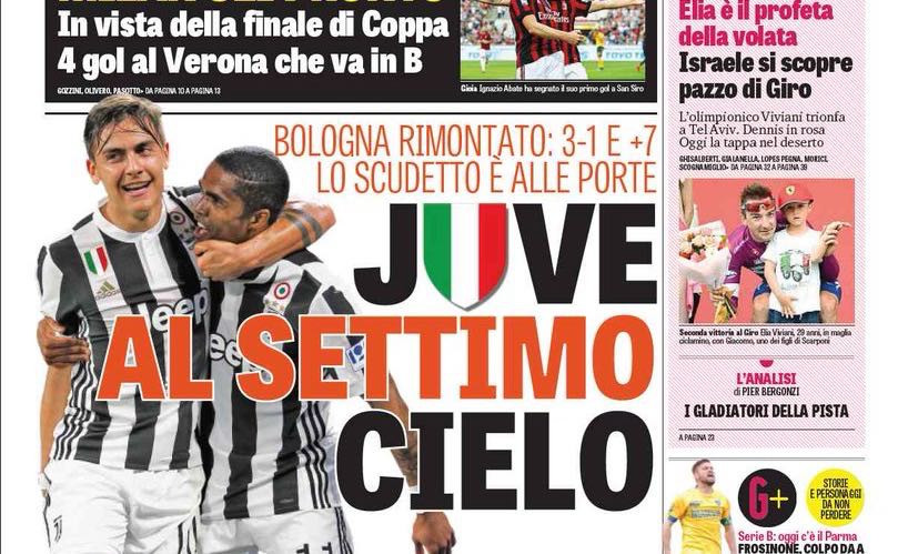 “Juve al settimo cielo” apre così la Prima Pagina della Gazzetta Sportiva che allude alla conquista del settimo Scudetto bianconero quasi conquistato dopo il 3-1 al Bologna. Nel taglio alto spazio al Milan “Pronto” alla finale di Coppa Italia dopo il 4-1 rifilato all’Hellas Verona.