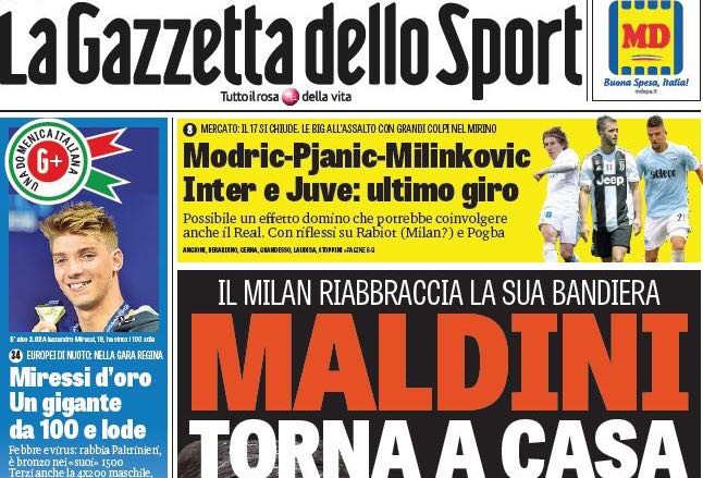 “I 3 segreti di Marotta”, titola Tuttosport, che poi aggiunge: “Ultimi 11 giorni di mercato, ma il Dg sta definendo alcune mosse per il prossimo anno: bianconeri in pole per Chiesa, prenotati Rabiot e La Gumina”. Sui movimenti del Torino: “Gonalons, ora si può. Missione Gibbs”; spazio poi al grande sogno di mercato nerazzurro: “Modric, porte chiuse al Real. L’Inter rilancia”. Il quotidiano torinese si occupa anche delle vicende di casa rossonera: “Riecco Maldini, il Milan torna ad essere la sua casa”.