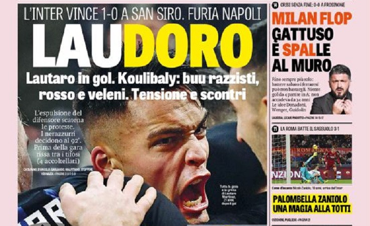 “Laudoro” è l’apertura della Gazzetta dello Sport dopo la rete dell’argentino dell’Inter, Lautaro Martinez, al 91′ contro il Napoli.