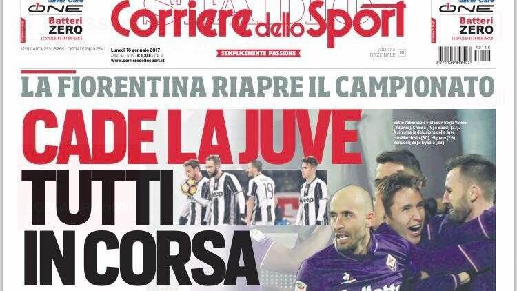 Fiorentina che “riapre il campionato” ed un ko che fa rumore: “Cade la Juve, tutti in corsa“, questo il titolo principale del Corriere dello Sport. Spazio anche alla rincorsa di Roma e Napoli, con Diego Armando Maradona che spinge gli azzurri: “Credo al titolo”. In chiusura anche l’esordio da sogno di Jovetic in Liga, che con un gol nei minuti di recupero permette al Siviglia di battere il Real Madrid e interrompe la striscia record di Zinedine Zidane.