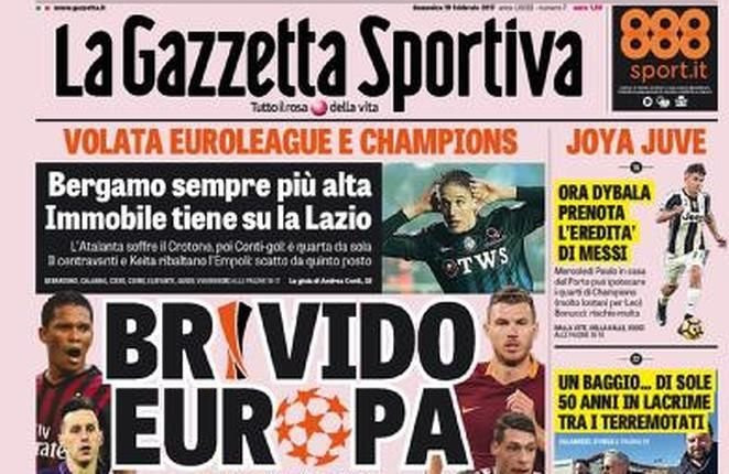 La Gazzetta dello Sport apre a tutta pagina con “Brivido Europa” elencando tutte le sfide di campionato che potrebbero decidere posizioni importanti per la Champions League ed Europa League. Taglio alto per gli anticipi del sabato con “Bergamo sempre più alta e Immobile che tiene su la Lazio”. Di spalla si parla di Dybala, dei 50 anni di Baggio ad Amatrice e della sconfitta in FA Cup di Ranieri.