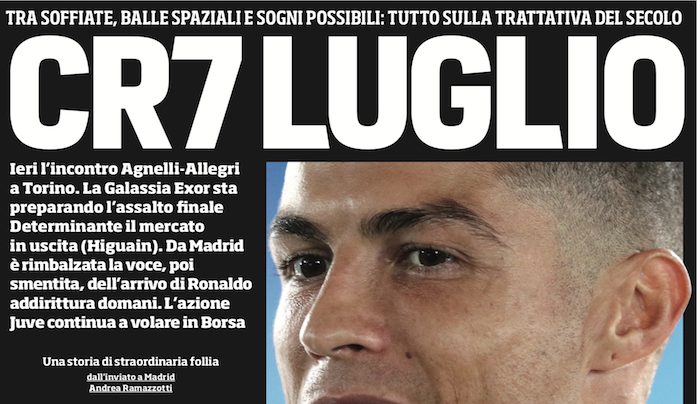 Ma anche gli altri giornali nazionali si dedicano al possibile arrivo di CR7 in Italia. Il Tirreno parla addirittura di un annuncio imminente in programma per sabato 7 luglio (il numero di Cristiano).
