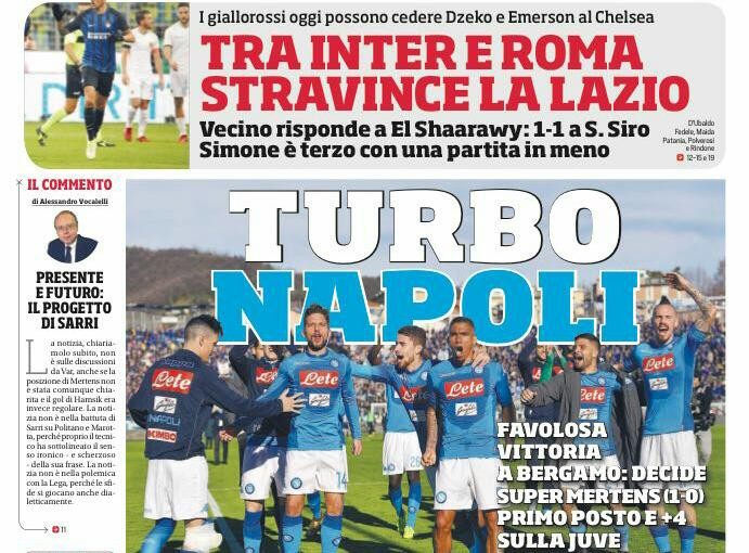 “Zuppa Inglese“, titola così Il Tempo: “Liverpool-Roma 5-2 – si legge nel sommario – ma come con il Barça non è ancora finita“. Sulla notte di Anfield si sofferma anche l’Unione Sarda: “Champions, finisce 5-2 per il Liverpool. Alla Roma adesso serve un altro miracolo” il taglio alto. Chiosa anche sul caso Joao Pedro: “Doping, deferito Joao Pedro. La procura chiede una squalifica di quattro anni”. Il Mattino si concentra, invece, sul Napoli, atteso a Firenze dopo l’impresa dello Stadium: “Sarri psicologo ‘Adesso sarà ancora più dura’“. “Corsa all’Europa nei vari campionati: l’Atalanta è in Pole” il taglio basso de L’Eco di Bergamo.