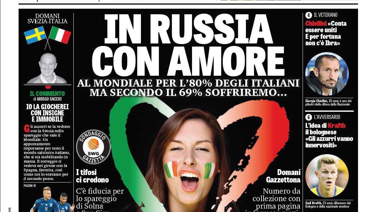 “In Russia con amore” è l’apertura de La Gazzetta dello Sport. “La Roma ha fame”, il Corriere dello Sport apre in prima pagina con l’intervista esclusiva a Eusebio Di Francesco. Di spalla, spazio al reportage sulla Svezia e il luogo (stadio compreso) in cui l’Italia si giocherà il Mondiale. Restando in tema playoff, ecco anche come gli Azzurri scenderanno in campo venerdì. In taglio basso, la Juventus con “il leader” Higuain. “Mercato Juve”, titola così invece Tuttosport che stila la lista dei 50 nomi di Marotta. In alto si legge del Torino e del riscatto di N’Koulou, ma anche di Svezia-Italia con le dichiarazioni di Chiellini. Di spalla spazio anche al Milan e all’Inter.