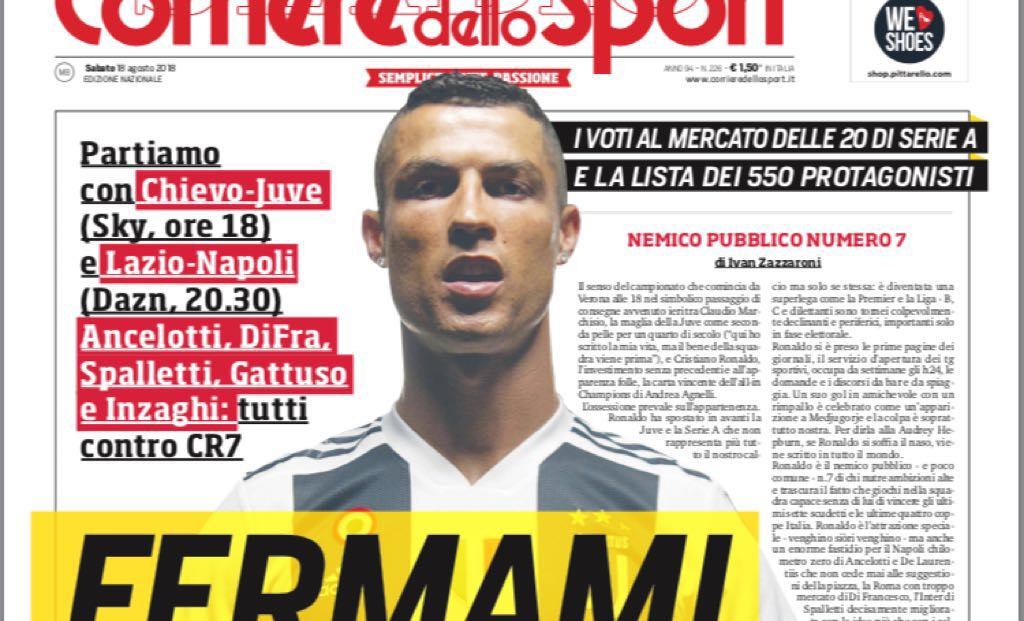 Ovvia l’apertura della Gazzetta dello Sport sul calciomercato terminato ieri. “Provate a prenderlo” è il titolo dl quotidiano sportivo, con Cristiano Ronaldo al centro di un’immagine con tutti i nuovi acquisti della sessione appena terminata. Sondaggi, opinioni e voti, tutti all’interno del quotidiano
