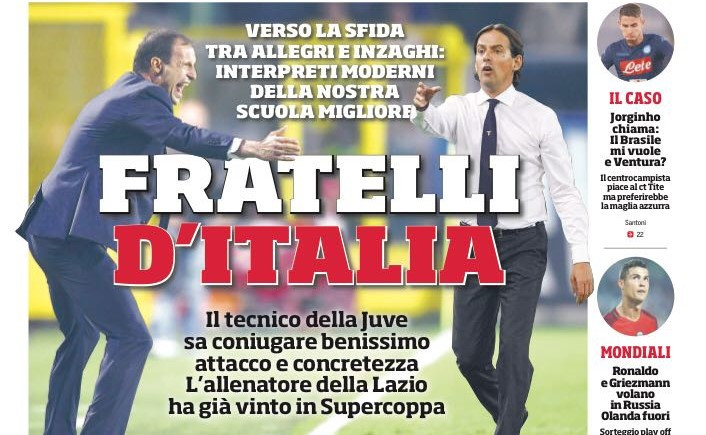 Il Corriere dello Sport apre con: “Fratelli d’Italia”. In alto: “L’Inter lancia la volata derby”. “Nazionali: divieto di sosta” è l’apertura di Tuttosport: un’inchiesta sulle pause che dividono il calcio. In alto: “Juve: bianconeri su Netflix”; “Toro: Baselli pronto anche a fare il capitano”.