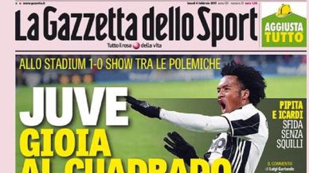 Week-end alle spalle, ma giornata di Serie A non ancora terminata con Roma e Fiorentina in campo martedì sera. E’ stata la domenica del derby d’Italia con la Juventus che ha steso l’Inter con un gol di Cuadrado. E’ “Gioia al Cuadrado” per la Gazzetta dello Sport, con l’Inter che gioca alla pari e recrimina con Pioli su alcuni episodi. In taglio basso c’è il Milan e il terzo ko consecutivo della squadra di Montella, sconfitti a San Siro dalla Sampdoria. Per il Corriere dello Sport è “Missile Juve”, con i bianconeri che volano in attesa di recuperare anche il match con il Crotone. In taglio alto spazio al Napoli e l’esodo previsto verso Madrid con 10000 tifosi azzurri che potrebbero riempire las calles madrilene. “Juve, un siluro all’Inter”. Questa l’apertura di Tuttosport, che in taglio alto dà spazio anche al Torino: “Toro, robe da matti. La squadra di Mihajlovic raggiunta dall’Empoli dopo essere andata in vantaggio, con i granata che hanno anche sprecato un calcio di rigore con Iago Falque. E cala il sipario su questa prima settimana di febbraio con la Serie A che va a dormire ma si risveglierà già martedì con il match tra Roma e Fiorentina. Noi, invece, ci saremo anche oggi per tenervi aggiornati su tutto ciò che succede. Buongiorno da Gianlucadimarzio.com.