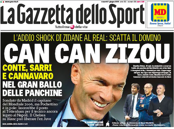 La Gazzetta dello Sport apre con “Can Can Zizou“, con le dimissioni dell’ormai ex allenatore dei blancos che aprono al toto panchina in casa Real Madrid: Cannavaro, Conte o Pochettino per sostituirlo. In basso a sinistra, la prima offerta della Juventus alla Lazio per Milinkovic-Savic (80 milioni) rifiutata da Lotito.