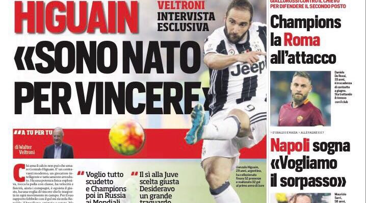 Il Corriere dello Sport dedica la prima pagina all’intervista a Gonzalo Higuain: “Sono nato per vincere”, dice il Pipita nel confronto con Veltroni. In basso, la carica di Agnelli: “Bisogna crescere ancora”. E intanto, di spalla, il duello Champions; “Roma all’attacco”, “Napoli sogna: ‘Vogliamo il sorpasso'”.