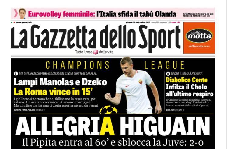 Era stato un po’ criticato in settimana, ci ha messo poco per riprendersi la Juve: Gonzalo Higuain è entrato nella ripresa ed ha risolto la partita con l’Olympiacos. E l’apertura della Gazzetta dello Sport è dedicata proprio al Pipita con “Allegria Higuain”, con l’argentino che entra al 60′ e sblocca la Juve: 2-0. In alto spazio dedicato all’altra italiana in Champions che grazie ai “lampi di Manolas e Dzeko, la Roma vince in 15′”. C’è un “Conte diabolico, che infilza il Cholo all’ultimo respiro”. Poi in basso spazio alle tre italiane in Europa League con “Montella capitan tempesta”, la “Lazio che si gioca la carta Murgia” e l’Atalanta a Lione.