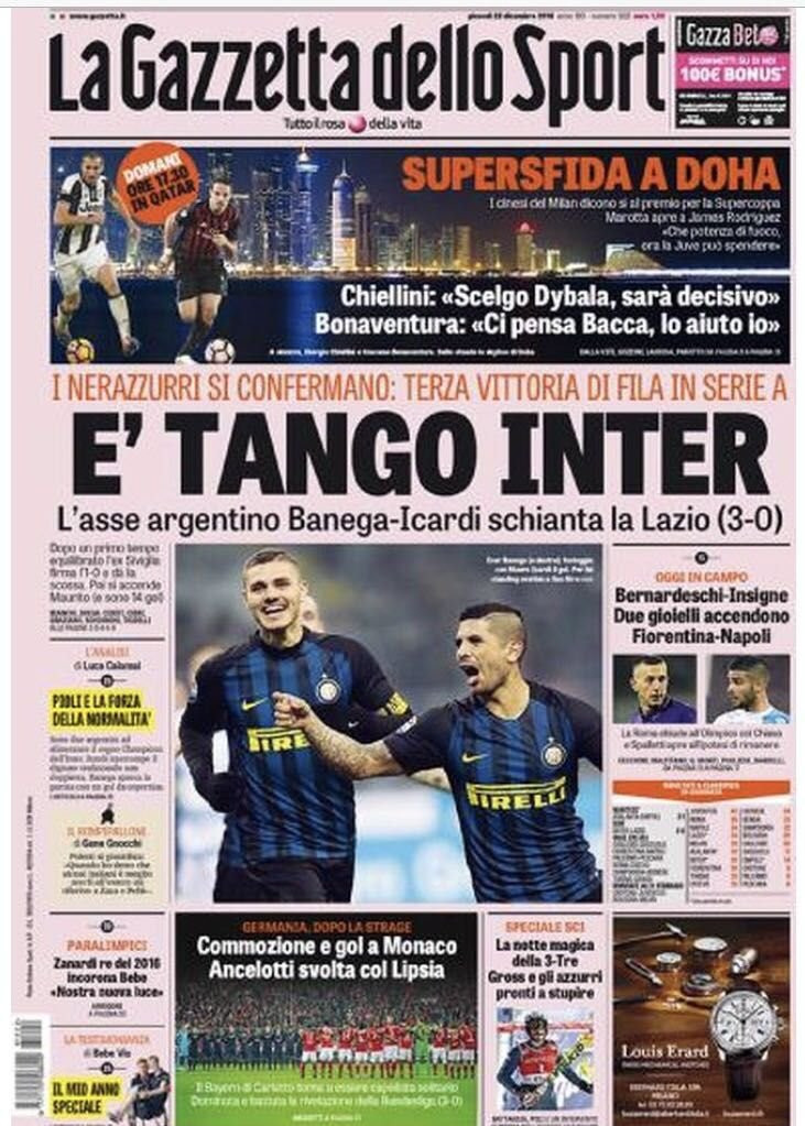 Tra martedì e mercoledì gli ultimi anticipi, poi oggi l’ultima giornata prima della sosta. 2016 quasi concluso, ormai manca poco. Domani, poi, è in programma la Supercoppa Italiana tra Milan e Juventus. Si gioca a Doha, in Qatar. Si assegna il trofeo. E le prime pagine dei quotidiani dedicano spazio a questo evento, senza contare la vittoria dell’Inter sulla Lazio con doppietta di Icardi. Ecco la rassegna stampa: