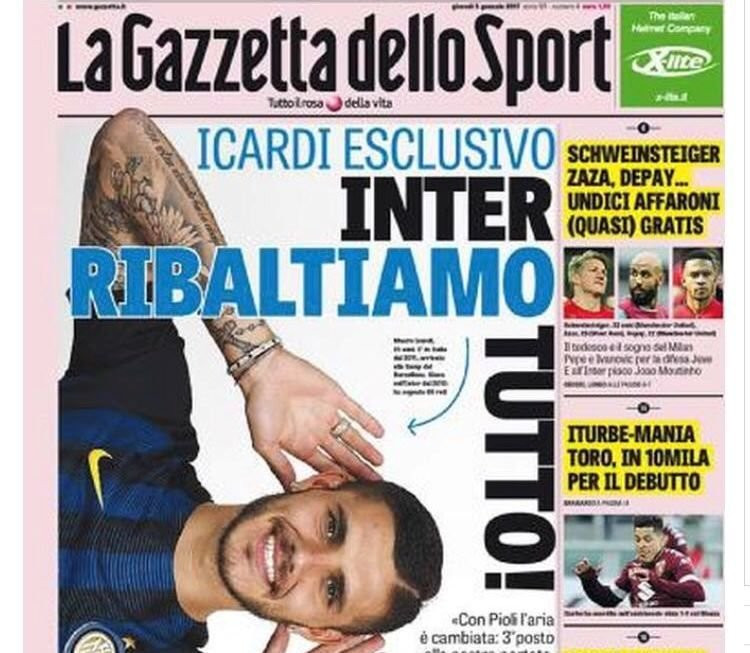 La Gazzetta dello Sport apre a tutta pagina con un’intervista esclusiva a Mauro Icardi che dice: “Inter ribaltiamo tutto. Con Pioli l’aria è cambiata. Terzo posto alla nostra portata. Con Suning scudetti e Champions e aspetto Gagliardini. Di spalla siparla di Iturbe e della “mania” per il paraguiano. “In 10.000 nell’amichevole del Torino”. Infine un approfondimento su 11 affari quasi gratis. Da Zaza a Depay.