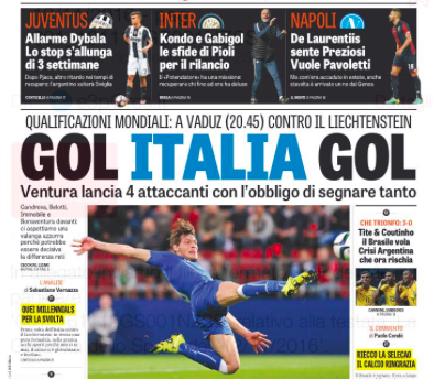 Calciomercato e tanta Italia, le prime pagine di domani si tingono d’azzurro. In Liechtenstein Ventura pronto a sfoderare il 4-2-4 e chiudere al meglio il 2016 di qualificazioni ai mondiali di Russia. Così i tre maggiori quotidiani sportivi.
