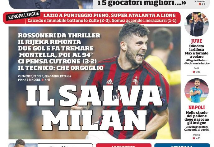 “Higuain ricaricato”, “Ancelotti scaricato”, apre così Tuttosport. In alto: “Toro su Teodorczyk”. A lato: “Milan, Cutrone salva Montella”, “Atalanta, il Papu fa vedere chi è: pari a Lione”, “Lazio in vetta con Caicedo e Immobile”.