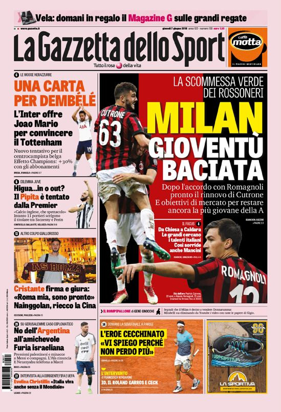 Tuttosport titola con “Juve, Max è al bivio”. In taglio alto “È l’Inter di Lautaro, ma Moratti sta con Icardi!”. Di spalla “Insigne-Callejon, è un euroNapoli”; “L’ex granata Fusi: ‘Belotti perfetto capitan Toro'”. In taglio basso “C’è preziosi dietro il nuovo Palermo”.