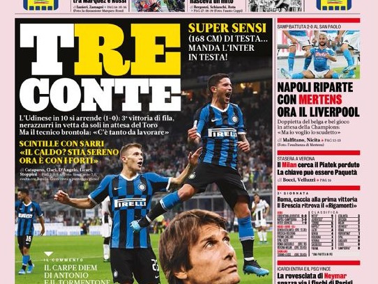 Dalla vittoria dell'Inter a San Siro contro l'Udinese grazie al gol di Sensi a quella del Napoli al San Paolo con un super Mertens. Lo 0-0 tra Fiorentina e Juve e l'analisi delle partite di campionato in programma questa domenica. Questo e molto altro nelle prime pagine dei quotidiani sportivi (e non) in edicola oggi.