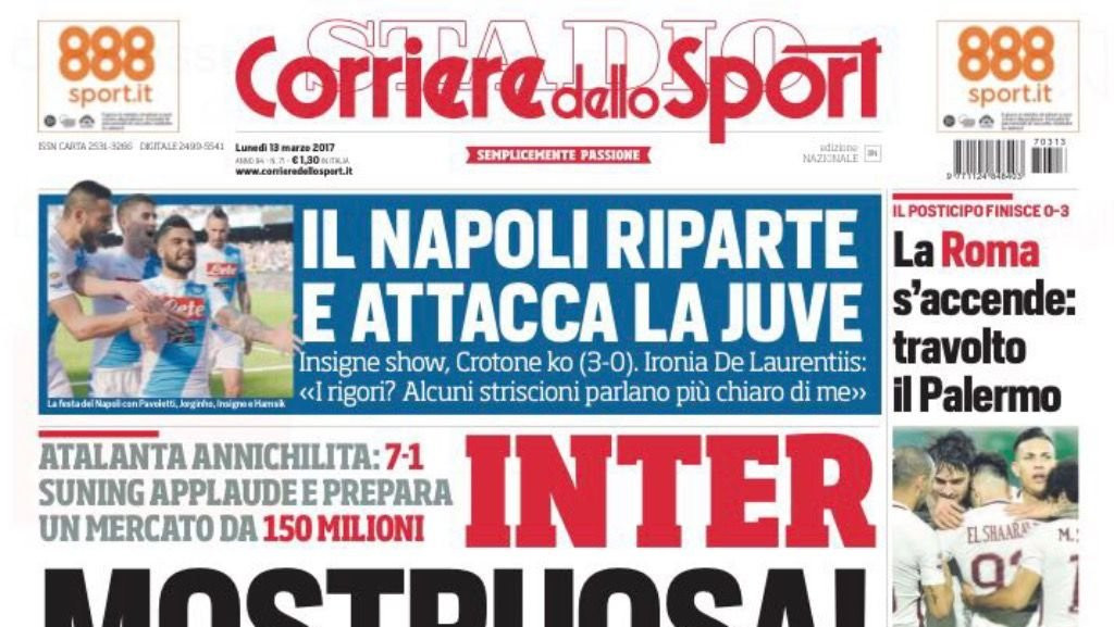 Anche il ‘Corriere dello Sport’ dedica la propria prima pagina all’Inter: “Inter mostruosa!”; mentre in alto “Il Napoli riparte e attacca la Juve”. A lato poi “La Roma s’accende: travolto il Palermo” e ”Lazio, caccia al quarto posto contro il Torino”.