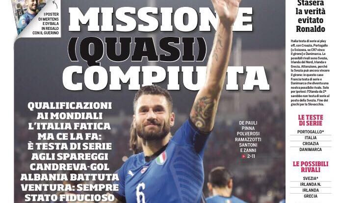 La vittoria della Nazionale di Gian Piero Ventura nel match contro l’Albania e il conseguente ingresso tra le quattro teste di serie dei prossimi playoff di qualificazione ai Mondiali a catalizzare l’attenzione, ma tra i titoli dei principali quotidiani in edicola c’è anche spazio per il campionato, che dopo la sosta riprende nel prossimo weekend.