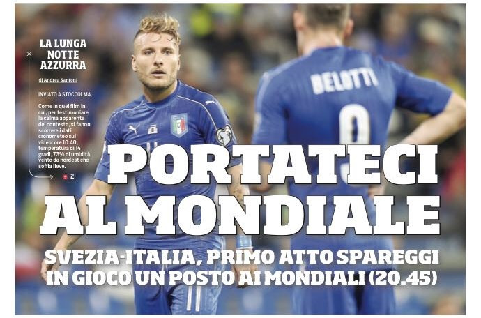Il grande giorno è arrivato. 180 minuti da dentro o fuori, in Svezia il primo atto dei playoff di qualificazione ai Mondiali del 2018. L’Italia insegue il pass verso la Russia, un paese intero unito al fianco degli azzurri. E i quotidiani, ovviamente, aprono con la nazionale di Ventura.