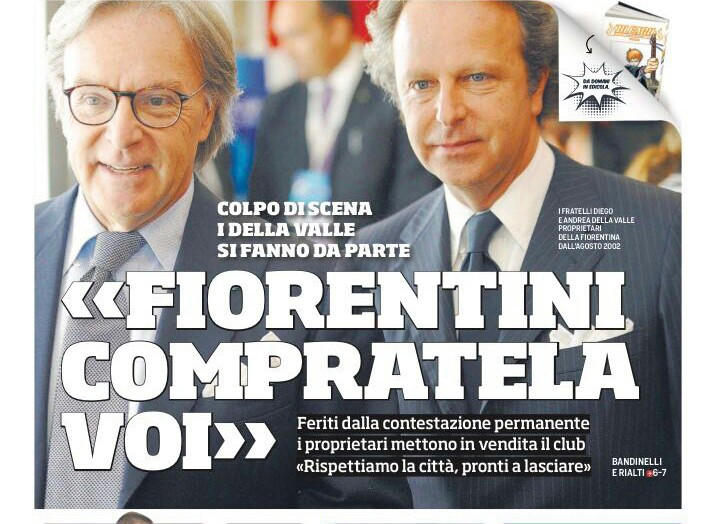 Dopo anni di presidenza i Della Valle sono pronti a cedere la Fiorentina. A darne conferma la stessa società attraverso un comunicato apparso sul sito ufficiale della Viola. Proprio con questa notizia apre la prima pagina del Corriere dello Sport: “Fiorentini compratela voi”. In taglio alto spazio all’Italia Under 21, che domani sfiderà la Spagna nella semifinale dell’Europeo: “Spagna – Italia atto primo: vale l’Europa”. In taglio basso il rifiuto di Allegri a Conte per Bonucci: “Allegri sbarra la strada a Conte “Bonucci leader resterà alla Juve”.
