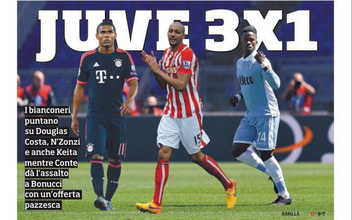 Mercato, mercato e ancora mercato. Sui quotidiani sportivi e non in edicola oggi, il calcio giocato lascia spazio alla finestra dei trasferimenti estiva. L’apertura del Corriere dello Sport è dedicata alla Juventus: “Juve 3 x 1”. “I bianconeri puntano su Douglas Costa, N’zonzi e anche Keita, mentre Conte dà l’assalto a Bonucci con un’offerta pazzesca”. In taglio alto spazio per un’intervista a Davide Nicola: “Io, Crotone, mio figlio e la forza del dolore”.