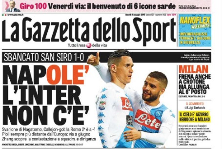 ‘Napolè, l’Inter non c’è’ è il titolo in prima pagina della Gazzetta dello Sport che esalta la vittoria degli azzurri a San Siro. Al centro, spazio alla vicenda Muntari, protagonista al Sant.Elia di Cagliari di un brutto episodio di razzismo. In spalla ecco il derby, con lo show di Keita che mette ko la Roma e avvicina la Juventus allo scudetto.