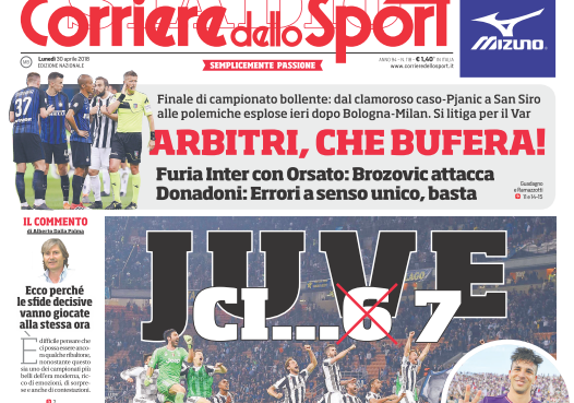 “A sei punti dal sogno”, l’apertura di Tuttosport è dedicata alla vittoria della Fiorentina sul Napoli, risultato che avvicina la Juventus – adesso a +4 – verso lo Scudetto. Il quotidiano torinese affronta poi tanti altri temi: “Il Toro è soltanto Sirigu”, nel taglio alto, a destra invece “Atalanta, Milan, Sampdoria e Viola. Brividi Europei”; “Il Lecce in paradiso ritorna in Serie B dopo sei anni d’attesa”. Il Corriere dello Sport titola: “Juve ci… 7”, nel taglio alto: “Arbitri che bufera”.