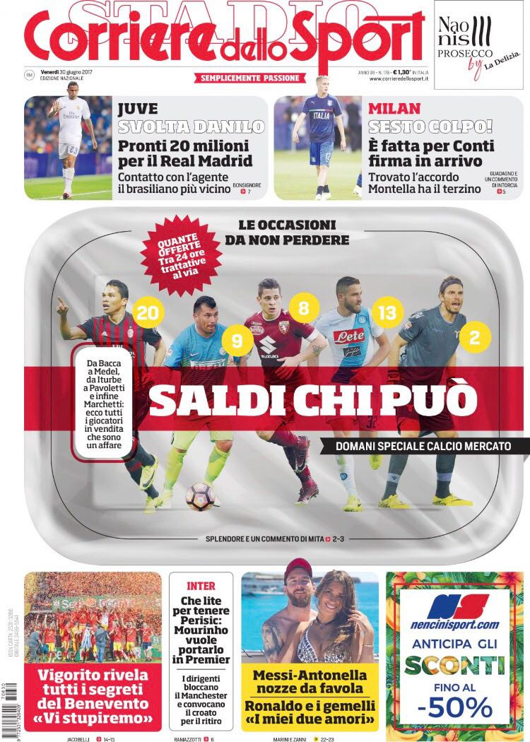 Il 3 luglio si avvicina, il calciomercato sta ufficialmente per parte. Sui maggiori quotidiani sportivi, non si parla d’altro. “Saldi chi può”, scrive il Corriere dello Sport facendo una rassegna di quelli che potrebbero essere i veri affari della sessione. “Da Bacca a Medel, da Iturbe a Pavoletti e infine Marchetti”, questi i giocatori da tenere sotto controllo. Il taglio in alto è dedicato alla Juventus – “Svolta Danilo, pronti 20 milioni per il Real Madrid” – e al Milan, sempre più vicino all’arrivo di Conti, il “sesto colpo” dell’estate. E l’ Inter? “Che lite per Perisic: Mourinho lo vuole portare in Premier”, si legge nel riquadro dedicato alla squadra nerazzurra.