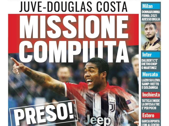 E’ il giorno di Douglas Costa alla Juventus. Con l’arrivo del brasiliano apre il TuttoSport, che titola “Missione compiuta”. Poi tanto altro mercato. “Miha ribalta il mercato del Torino”, con l’allenatore che vuole solo prime scelte. Poi la firma di Donnarumma, Dalbert all’Inter, la Lazio su Lucas Leiva e tanto altro.
