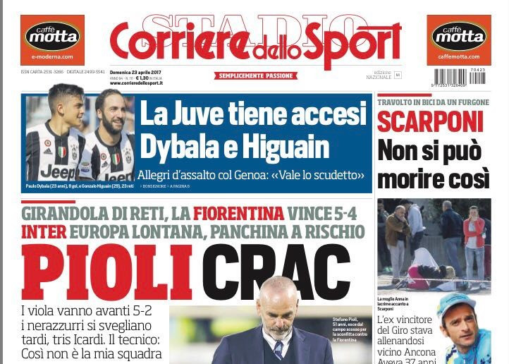 Il Corriere dello Sport invece dedica il titolo centrale alla sconfitta dell’Inter con la Fiorentina: “Pioli Crac”. In taglio alto spazio alla Juventus: “La Juve tiene accesi Dybala e Higuain”. Spazio anche per la vittoria del Chelsea il FA Cup: “Conte va in finale, poker al Tottenham”.Il QN invece apre con la sconfitta dell’Inter in casa della Fiorentina: 5-4 il risultato finale al termine di una gara pazza e imprevedibile. “Crollo Inter” è il titolo scelto. Sul Mattino campeggia invece la foto di Insigne con una maglia del Napoli in mano, niente cognome sulle spalle, solo una data: 2022, l’anno in cui scadrà il contratto appena rinnovato: “Insigne, capitan futuro del sogno scudetto”.