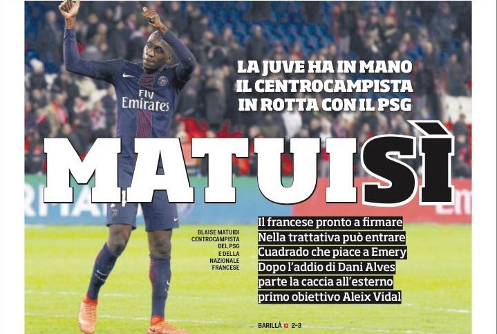“Matuisì” sul Corriere dello Sport. “La Juventus – si legge – ha in mano il centrocampista in rotta con il PSG. Il francese pronto a firmare. Nella trattativa può entrare Cuadrado che piace a Emery. Dopo l’addio a Dani Alves parte la caccia all’esterno, primo obiettivo Aleix Vidal”. In alto: “Under 21, il pericolo si chiama Schick: contro i ceki ci giochiamo il futuro”.