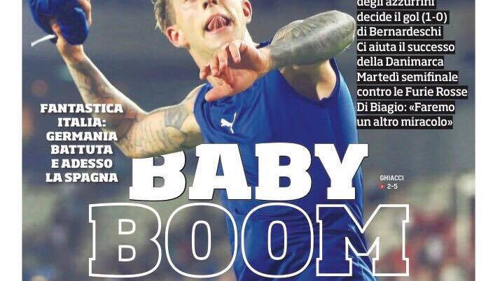“Che cuore ragazzi! E ora la Spagna”. La prima pagina de La Gazzetta dello Sport celebra l’impresa dell’Italia Under 21, che battendo la Germania si qualifica per le semifinali dell’Europeo. Poi spazio al mercato: “Derby per Kalinic, Corvino vede Inter e… Milan. Piano Atalanta per blindare Papu Gomez. A volte ritornano, Sirigu-Torino, Borini-Lazio”.