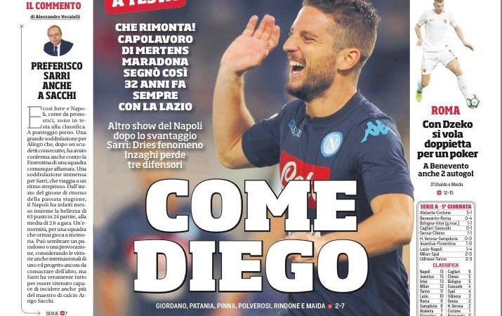 “Senti che Inter” ecco il titolo del Quotidiano Sportivo che si concentra anche sulla situazione del calcio italiano con le dichiarazioni di Cannavaro e Ferrara, mentre di spalla spazio al Milan e al rinnovo di Messi col Barça. Sulla prima de Il Tempo domina la questione stadio della Roma; c’è il Palermo invece sulla prima del Giornale di Sicilia e la “Rivoluzione Sarri” su Il Mattino. Cittadella e Padova sulle pagine del Mattino di Padova, mentre si legge del “tonfo del Venezia” su La Nuova di Venezia e Mestre. Il Resto del Carlino celebra la vittoria del Bologna sulla Samp e infine la Gazzetta del Mezzogiorno si concentra sul derby pugliese tra Bari e Foggia.
