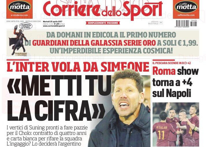 Il Corriere dello Sport individua il futuro allenatore dell’Inter: i nerazzurri “volano da Simeone”, dandogli carta bianca sull’ingaggio. Quindi in appoggio altri articoli sui cambi di allenatori e sulla scelta del ritiro pre-Napoli. Di spalla, il “Roma-show” a Pescara. In taglio basso, “la Juve del futuro, nel segno dei giovani”.